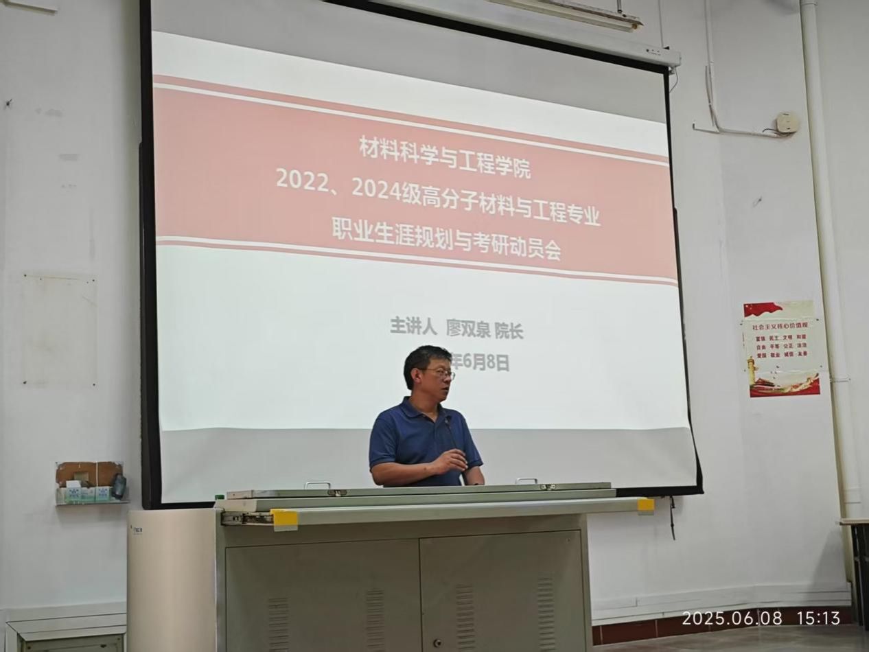 2025年6月8日下午,bw西汉姆联在2教108教室举办面向2022、2024级高分子材料与工程专业同学的职业生涯规划与考研动员活动。本次活动由高分子材料科学与工程专业责任教授廖双泉教授主讲,2024级高分子材料与工程专业全体同学及班主任、2022级高分子材料与工程专业同学参与,由兼职辅导员刘纪泽老师主持。