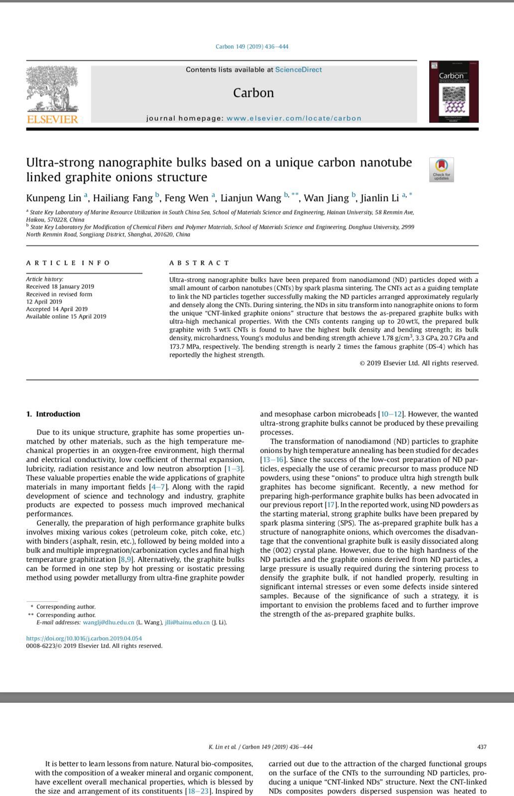 近日,bw西汉姆联李建林教授、文峰教授科研团队在高性能石墨材料研究中取得重要进展。 这项工作的部分研究成果发表在碳结构材料的国际顶级期刊Carbon (Ultra-strong nanographite bulks based on a unique carbon nanotube linked graphite onions structure, 2019, 149, 436-444)。 在前期的研究工作基础上,研究人员通过仿生设计,在纳米金刚石粉体中引入少量碳纳米管,巧妙地解决了金刚石粉体转化制备石墨块体内部残余应力较大的难题。所制备的石墨块体为纯石墨相,其抗弯强度达到目前最强石墨材料的2倍,这一工作有望突破石墨材料的高精度加工的技术瓶颈。目前正在和有关单位合作,开发某些领域的专用石墨元器件。 2016级硕士研究生林坤鹏为论文第一作者。这项工作是与东华大学的相关课题组合作共同完成。(文/图:李建林)