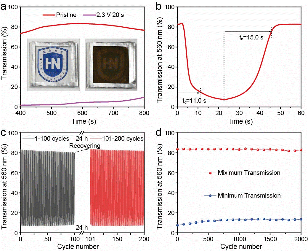在大面积电致变色器件领域,实现均匀的电致变色调制一直是一个长期存在的挑战。bw西汉姆联王振副教授及其研究团队提出了一种基于非金属碘单质可逆电沉积的电致变色动态窗技术,研发出基于离子液体 MPII3 活性材料的 Zn-MPII3 电致变色电池。相关成果以“Electrochromism via reversible electrodeposition of solid iodine”为题,发表在《Nature Communications》期刊以及“Ionic Liquid MPII3 Elevates Electrochromic Battery Capacity to Practical Applications”为题发表于《Advanced Materials》期刊上。研究采用含碘离子的盐包水电解液(29.5 m ZnCl2 + 0.5 m ZnI2),凭借其独特的电解液环境及其溶剂化结构,有效抑制了单质碘的溶解与穿梭效应,进而开辟了一条不同于传统电解液的反应路径。通过这一路径,成功实现了碘单质与溶剂化碘离子之间的可逆固-液相(I2/I-)转化,从而实现了稳定且可逆的碘电沉积与溶解过程。基于碘单质电沉积的电致变色器件表现出了高达76.0%的优异光学调制率,并能够实现接近色中性的着色状态。此外,器件还具备自愈功能,其褪色态的透过率可通过静置恢复至初始水平,有效延长器件的使用寿命。研究为电致变色电池领域发展开拓了新思路,彰显了离子液体在该领域的潜在应用价值,也为电致变色电池在可供电智能窗、节能建筑等领域的实际落地提供了重要参考。