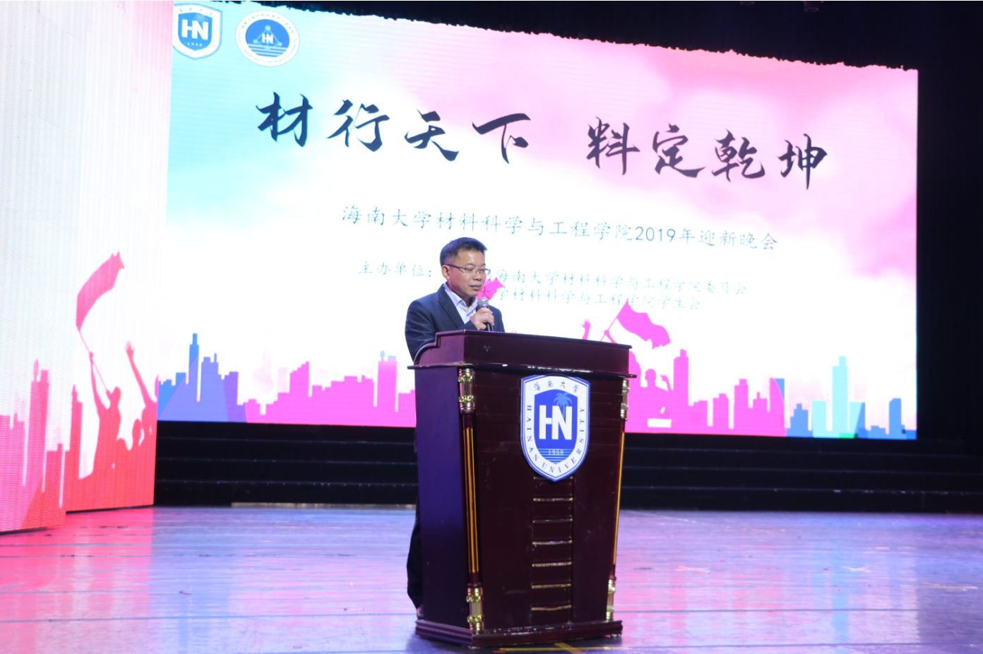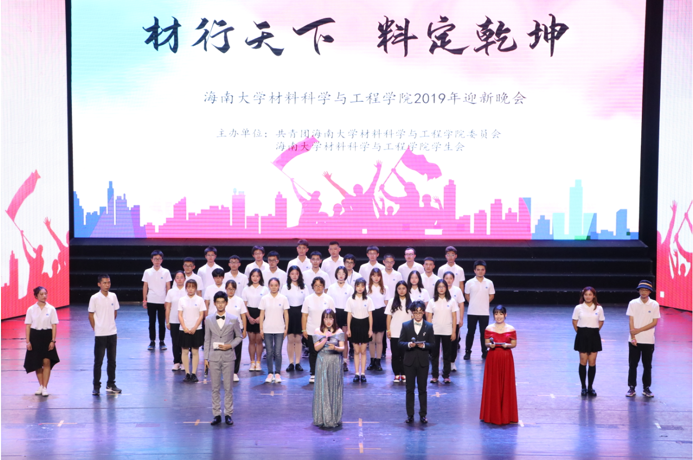 晚会于晚七点半正式举行,由公司2019级本科新生李宜泽、冯嘉慧、王士诚和李娇担任晚会主持。在热情澎湃的开场舞过后,是一段以爱国情怀为主旋的朗诵。随后,胡先文书记上台发言,代表公司表明对迎新晚会的支持,以及对2019级本科生和研究生新生入学以来优秀表现的肯定,胡书记指出材料公司是一所追求进步、承载着梦想和希望的公司,秉承“崇德明志 求是唯实”的院训,不断加强内涵建设,提高办学质量,得到了社会各界的一致认可。今年是海南推进自贸区港建设和公司深化内涵发展、不断追求卓越的关键年,材料师生的求学梦与之深度交织,这是时代赋予海大的重大机遇也是大家的人生际遇。如今,崭新出发的19乘着新时代的浩荡东风,定将不负众望、继往开来、砥砺奋进,早日成为引领未来材料的佼佼者。