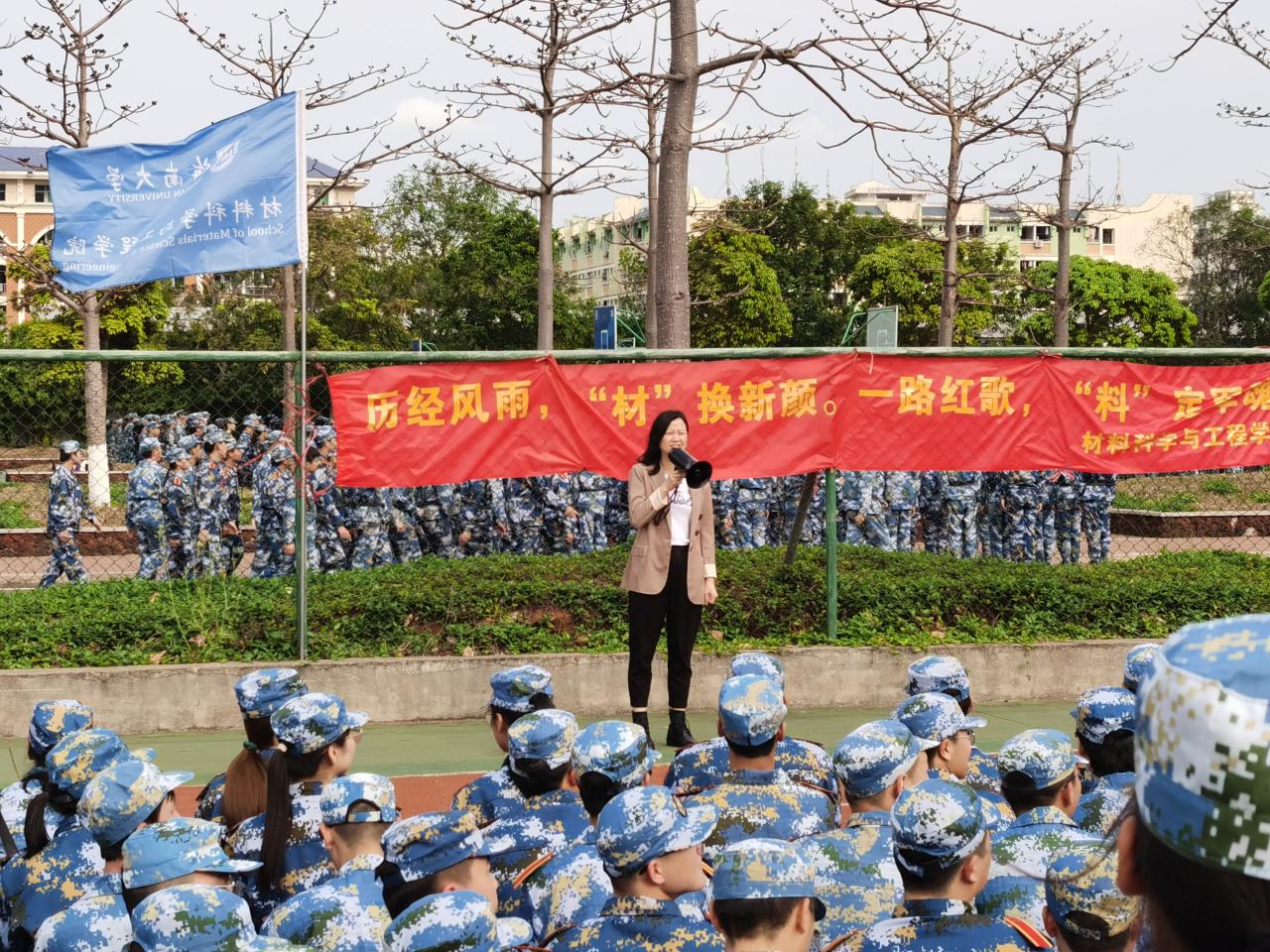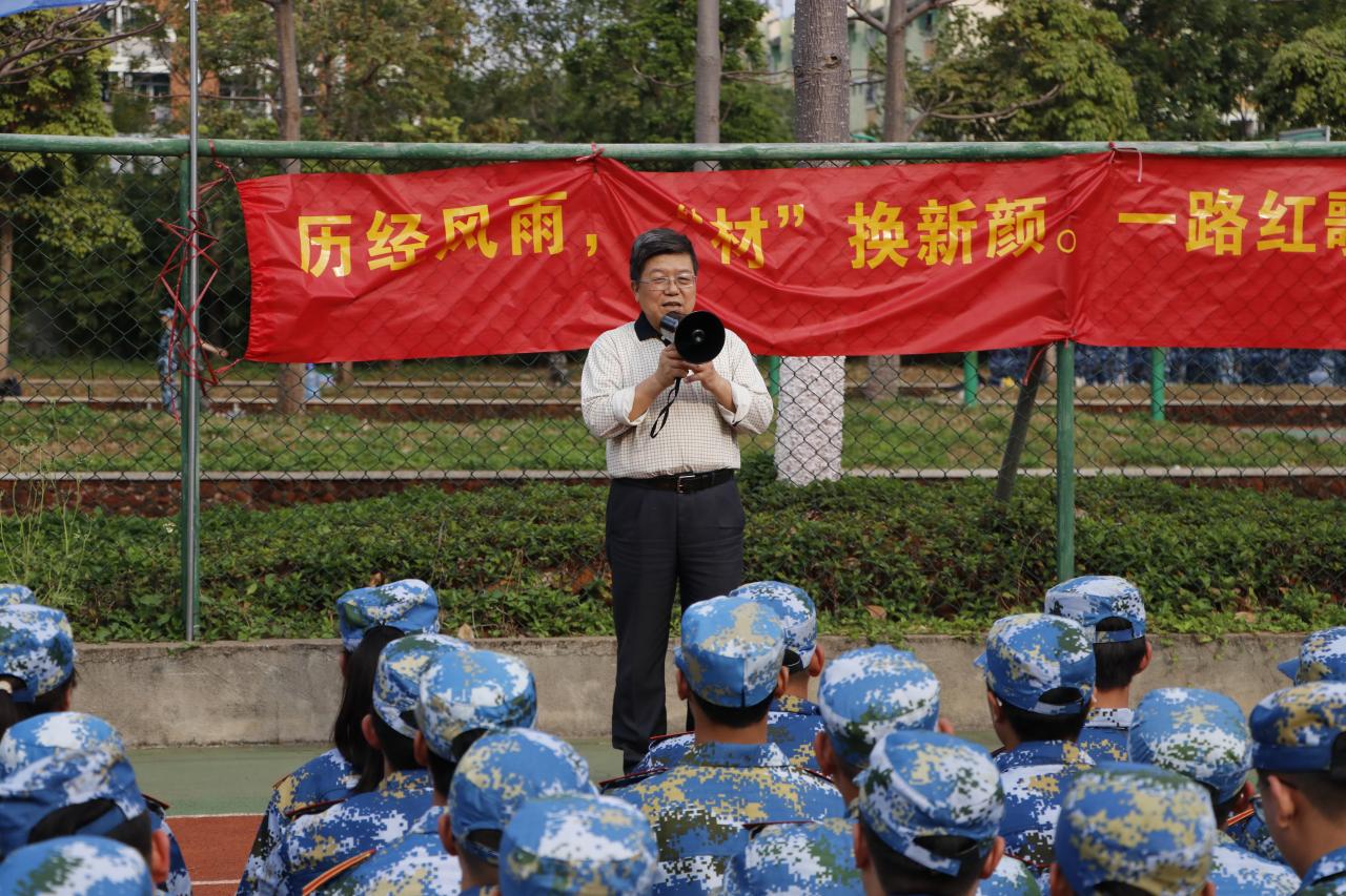 党委副书记周郭军介绍了各位到场领导老师及2020级军训的总体情况,并用“宝剑锋从磨砺出,梅花香自苦寒来“、”掉皮掉肉不掉队,流血流汗不流泪 “两句名言激励全体参训员工,敢于吃苦、认真军训。