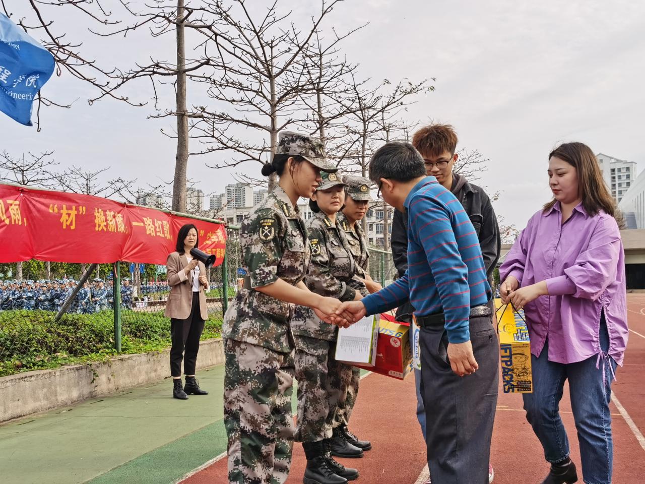 胡先文书记代表公司向军训教官送上慰问物资并表达了对十三中队教官的高度肯定和赞扬,希望三位教官在后续的军训中,高标准、严要求,训出水平、训出风采。