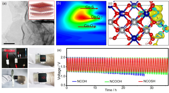 图:(a) 镍钴羟基氧硫化物 (NCOSH) 的晶体结构与微观形貌图。(b) NCOSH的同步辐射小波变换 (MWT)结果。(c) NCOSH正极材料的差分电荷结构图。(d)以NCOSH为正极材料开发的柔性固态锌-空气电池及其工作照片。(e) NCOSH基柔性固态锌-空气电池长循环稳定性结果。