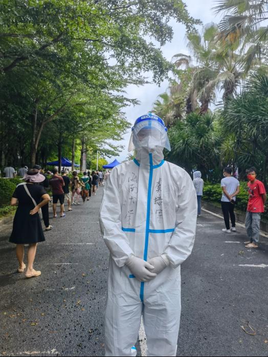 在抵达英州镇后的第二天,根据属地疫情防控形势和分工,虞培军老师被调往英州镇天堂村参加核酸检测任务。在执行任务的过程中,第一次身着不太合身的“大白”防护服的他,主动承担起了维持居民核酸检测秩序的工作,并与核酸检测组长及队长积极沟通,互帮互助,在炎炎烈日下,对该村千余名居民进行了核酸检测,确保“不落一人”、“应检尽检”。