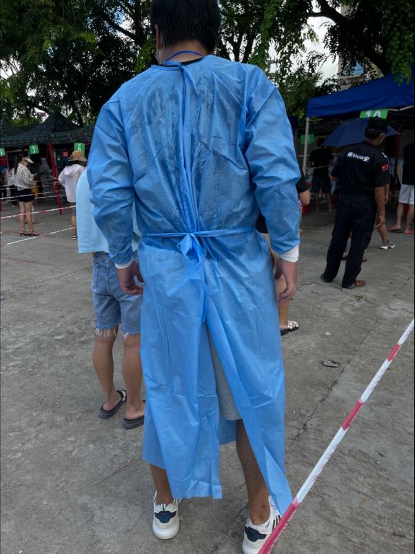 图五:汗水浸透了衣衫,渗出了隔离服,虞培军老师在居民核酸检测的队伍中穿行,检查大家的健康码。