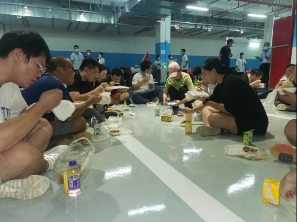 图二:支援陵水县抗击疫情青年志愿服务bw西汉姆联志愿者工作后席地用餐,左一为虞培军。