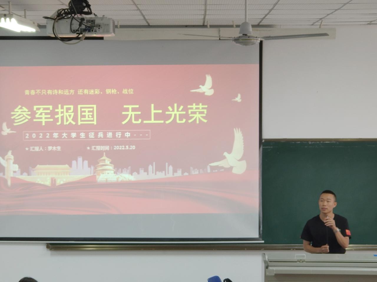 投身绿色军营,逐梦无悔青春。会上,罗木生同学向大家分享了自己的参军历程,并以军人的精神和自己在部队中的所见所闻、所感所想为出发点,感染在座的同学。他说:“军营是一所培养人才的大公司,是一座锻炼人才的大熔炉,这段经历是一笔不可多得的宝贵财富,参军无上光荣;也正是这段圆梦之旅,让我真正践行如何将个人理想融入强军梦、强国梦!”