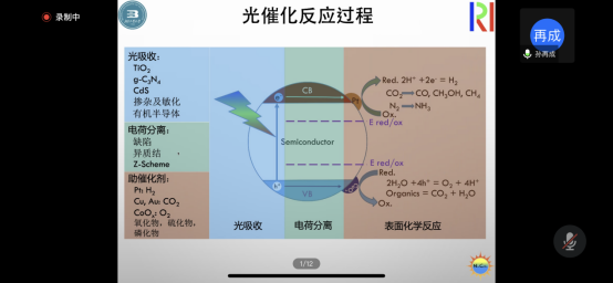 报告会上,孙再成教授首先针对自己的研究团队和研究领域进行了整体介绍。本次讲座主要围绕光催化开展,光催化过程主要包含光吸收、电荷分离和表面化学反应三个基本过程。对于g-C3N4光吸收的拓展,引进电子受体虽然可以提升光催化效率,但是主要还是由于电荷分离效率的提升。通过引入碳点来拓展g-C3N4的光吸收,促进其电荷分离。构建高效的电荷分离体系常见的方式有:表面缺陷、异质结和直接Z-Scheme。直接Z-Scheme是一种有效的方法,对于构建直接Z-Scheme型光催化剂孙再成教授提出了利用光沉积来实现目的性构建。助催化剂的构建,具有一个广阔的研究前景,因为其不仅限于目前的产氢、CO2还原、N2固定,而且更重要是光催化有机反应拥有的广阔空间。