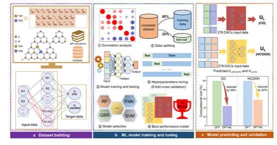 全球能源需求激增导致CO2排放攀升,光催化CO2还原被视为绿色破局之道。原始 g-C3N4 活性位点少,对 CO2 吸附能力有限,性能受限,双原子催化剂具有高原子利用率和显著协同效应, 然而,过渡金属组合数量庞大,传统试错法耗时巨大。本研究创新融合机器学习与密度泛函理论,对276种g-C3N4负载双原子催化剂实现高通量预测,发现FNN模型能够准确的捕捉双原子催化剂的性质,同时能够快速预测并筛选出RuHf、VV@g-C3N4高效制CO,MoMo、CrMo@g-C3N4高效制HCOOH,并兼具可见光响应与热力学稳定性,为实验合成按下“快进键”。