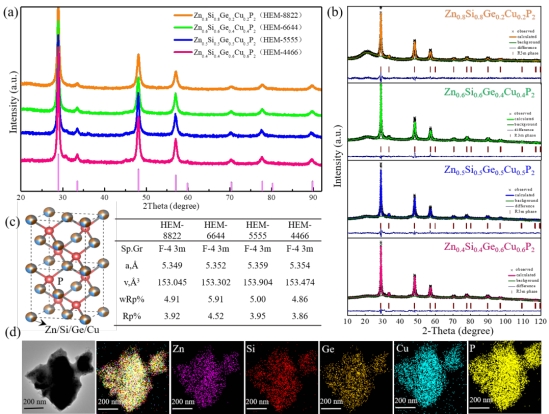 图2. 系列ZnxGeyCuzSiwP2高熵固溶体的XRD图谱(a),Rietveld结构精修图谱(b),晶体结构示意图和晶胞参数(c)及TEM元素分布图片(d)