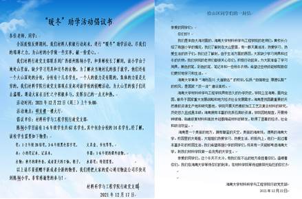 全国疫情反弹期间,我们材料行政党支部联系到广西梧州陈垌小学,和黄彬董事长了解到,该小学由于地处山里面,缺少学习用具和过冬的衣物。陈垌小学目前有1-6年级共67名员工,为了解决当地村民的孩子就学,他们还有一个大山深处的分校,分校有十几名员工。我们材料人积极行动起来,进行“暖冬”助学活动,尽我们的绵薄之力,为山村的小学做一些实事,献一份爱心。